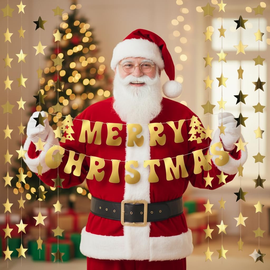 Complete Christmas Decoration Set: Includes 1 Merry Christmas banner and 4 golden star frills