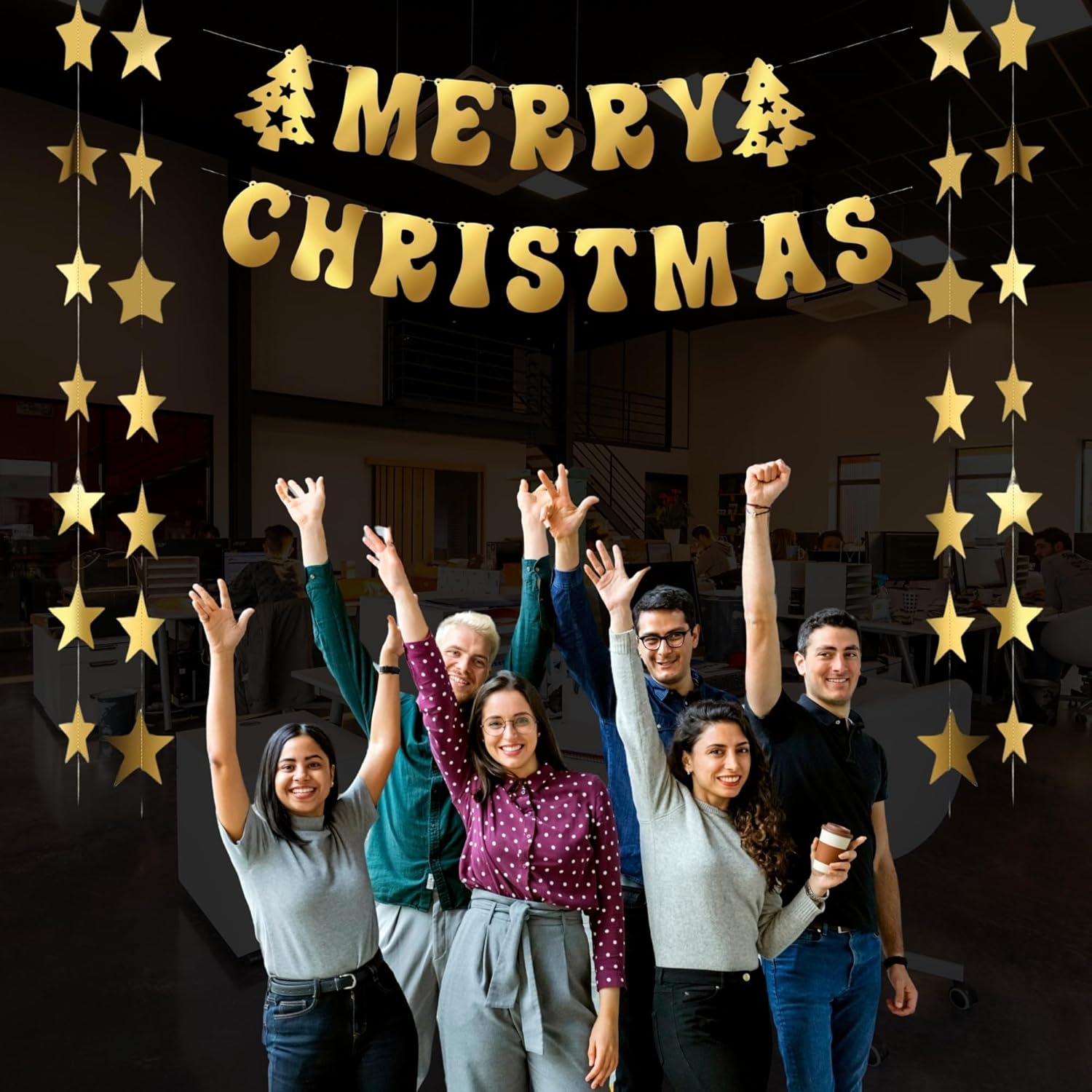• Complete Christmas Decoration Set: Includes 1 Merry Christmas banner and 4 golden star frills, perfect for decorating your home, office, church, or holiday event.